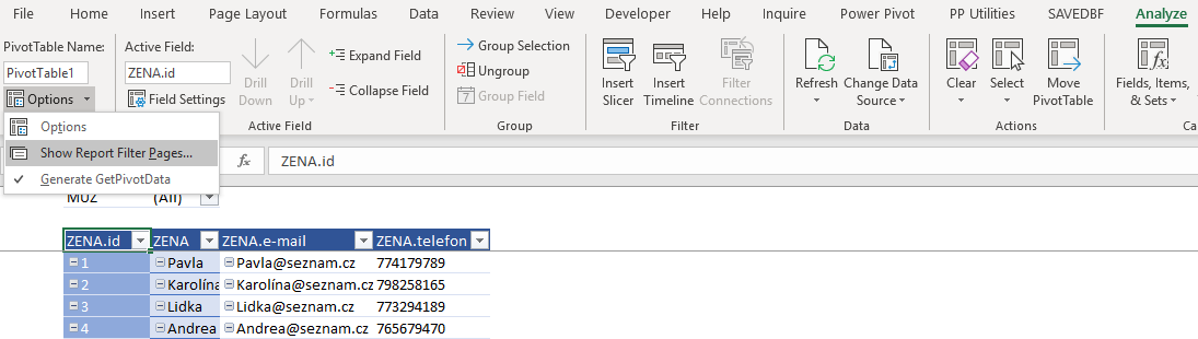 Do môjho riešenia s PQ som doplnil aj dve kt, ktoré umožňujú k mužom priradiť ženy a k ženám mužov (stačilo prehodiť dimenzie). V prípade potreby sa dá vygenerovať z jednej kt (,ktorú necháte na liste) zoznam listov (viď. obr) napr. mužov a k nim prislúchajúce ženy. Pre obidve kt je použitý jeden zdroj MUZI (ale môže byť aj ZENY).