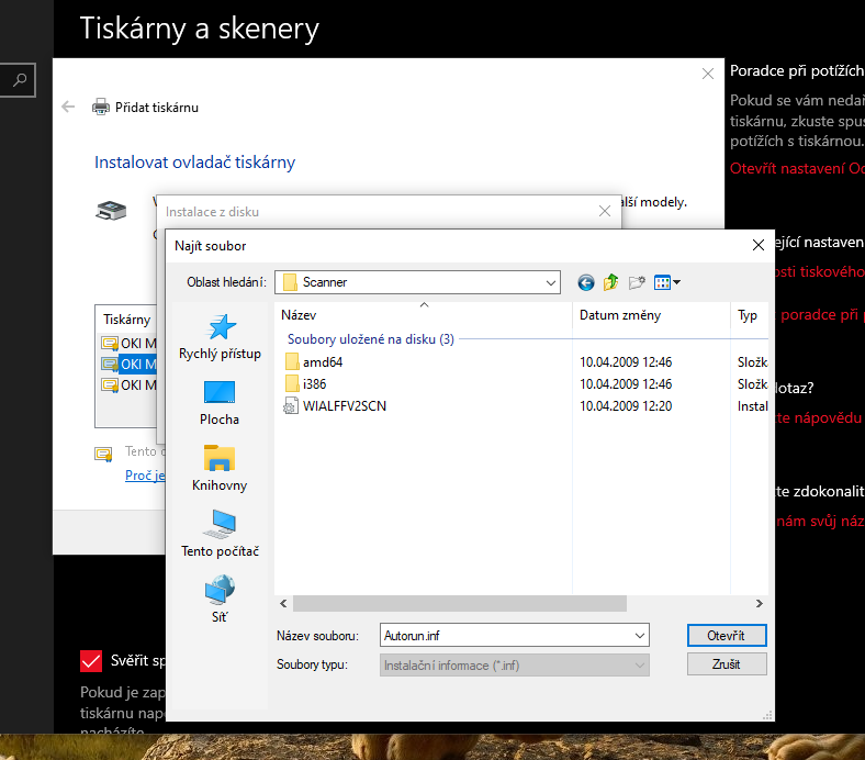No, zkusila jsem ještě přidat tiskárnu/skener ručně. Ovladače pro tiskárnu se mi normálně načetly, pro skener mi to vyhodilo tuto hlášku: