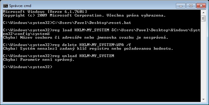 reg unload HKLM\MY_SYSTEMMísto klasických uvozovek tam máš horní a dolní uvozovky, které čeština přeloží na přehlasované o.
