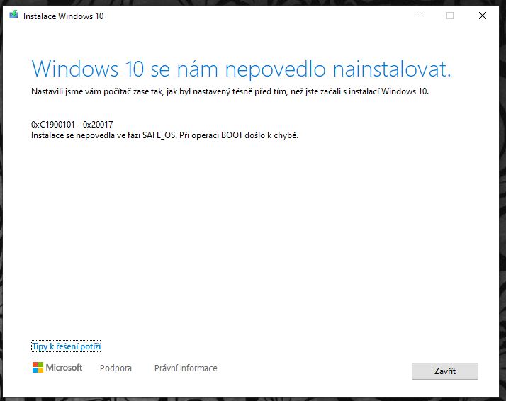 Chvilku to vypadalo nadějně, promazal jsem disk, přejmenoval ten soubor. Přes ISO soubor to vyhodilo chybu viz screen, v tipech k řešení potíží jsem našel chybu viz screen, ale netuším, co to může znamenat. Zkusil jsem to i přes Pomocníka aktualizací, příprava se povedla do 100 %, pak se PC mělo restartovat, dlouho se načítalo, ale verze zůstala stejná. :wtf: