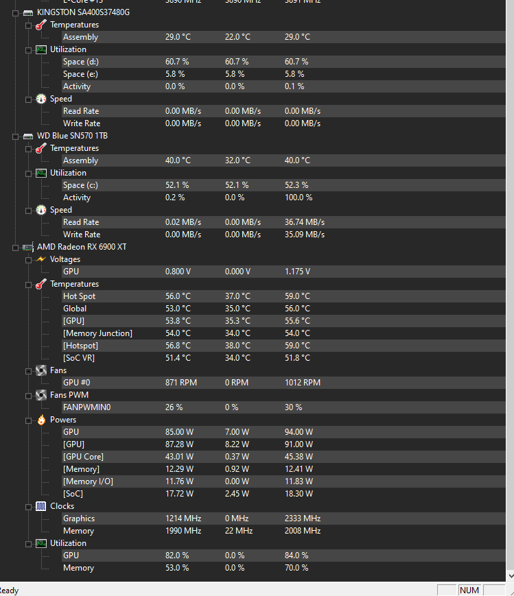 Přikládám i fotky HWmonitoru po Heavyload zátěží. Musím říct akorát, že GPU neodpovídá teplotám, které mám při hraní. Tam to skáče až na 90°C. U Cyberpunk se stalo že i na 100°C. Obzvlášť, když nemám otevřený boční panel.