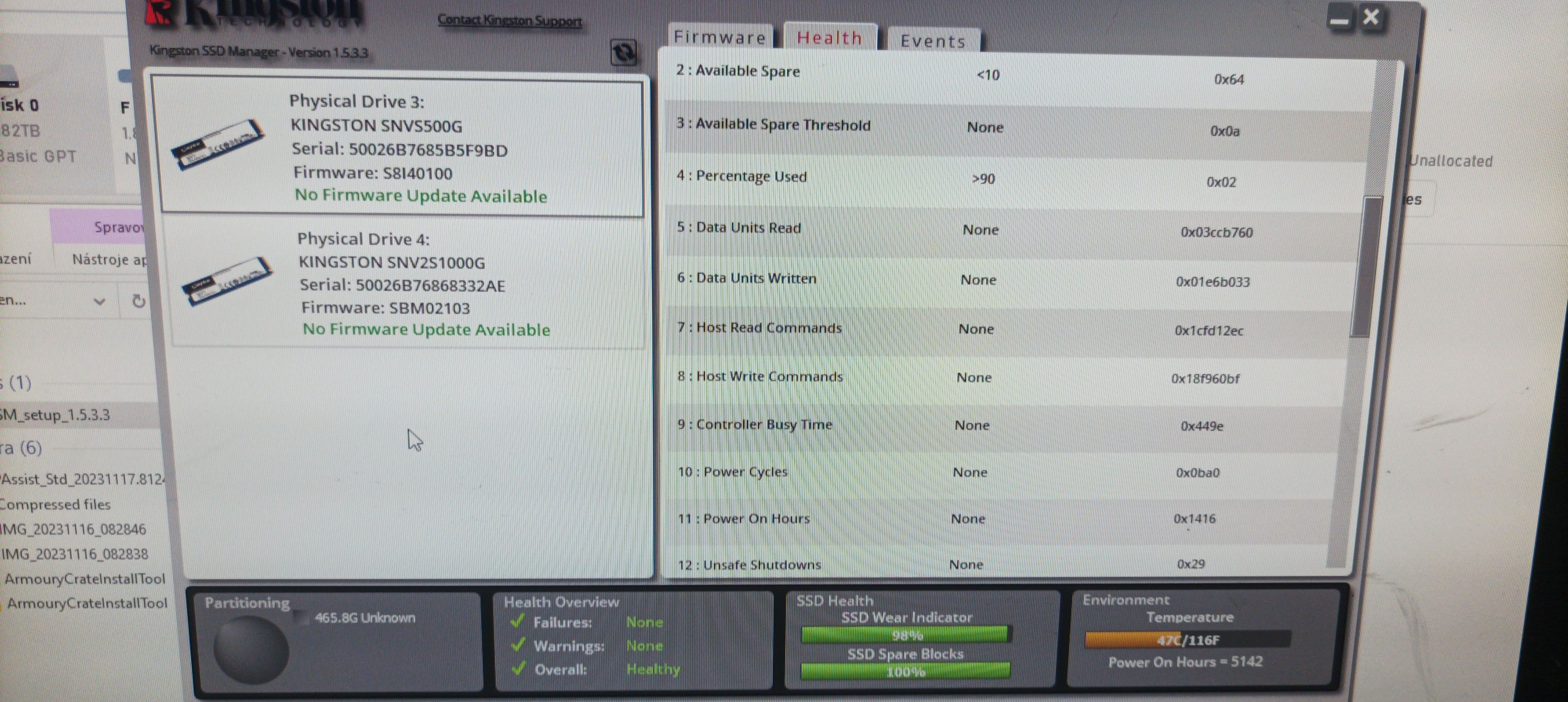 Po pár hodinách jsem si chtěl pustit seriál v nízké kvalitě takže žádná žátěž a necelou minutu běžel a následně se sekl obraz a zvuk ještě chvilku šel pak začal funět větrák, píplo to a šlus. Ok říkal jsem si něco se potentovalo tak jsem šel znovu do instalačky, ale ta se už nepovedla. No prostě jsem zkoušel přehazovat i původní disk a tento a skončil jsem na tom, že původní disk bez problémů běží, ale ten Kingston v notebooku ne. Občas ho není vidět ani v biosu a někdy když zkouším instalačku ho to tam sice načte do výběru, ale nejde odebrat jednotlivé oddíly ani nainstalovat.