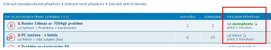 Update fóra "zalepil" několik bezpečnostních děr a měl by přinést i malé zlepšení ve výkonnosti fóra. Asi jediná viditelná změna pro běžného uživatele je změna zobrazování času od posledního příspěvku (např. v TOP XX), kdy se všechny příspěvky vytvořené před méně jak 1 hodinou zobrazují s popiskem "před X minutami..." viz. obr níže. Dále proběhl update MODu "RECENT TOPICS", který se stará o zobrazení TOP XX na úvodní straně. Update by měl výrazně zlepšit načítání úvodní strany (obsahuje efektivnější SQL dotazy), zároveň přináší několik vylepšení, jako je možnost rozložení TOP XX do několika stran. Tohoto jsme rovnou využili a tak je nyní TOP XX nově nastaveno na TOP 30 s tím, že je rozloženo do 2 stránek.