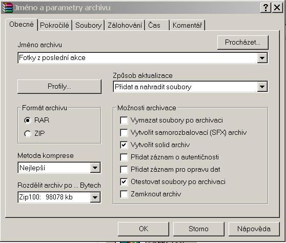 Metoda komprese - volba umožňuje nastavit, jak moc chci data "zmáčknout" (zkomprimovat). Obecně platí, čím vyšší metoda komprese, tím menší je výsledný soubor archivu (tím víc fotek pošlu), ale zabere to delší čas (u modernějších strojů nepodstatná věc).