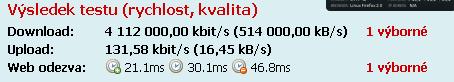 Jinak naměřené hodnoty jsou 3992kbit/s a 384 kbit/s, což zhruba odpovídá tarifu 4/0,5Mbit.