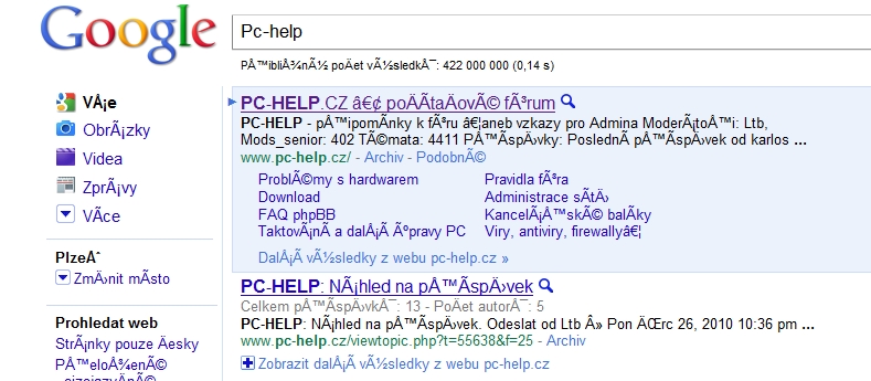 Ve Firefoxu 3.0.7 se mi na stránce Google (vyhledávání) zobrazují špatně znaky (viz. obrázek). V IE8 je to v pořádku. Znaková sada (kódování) je nastaveno na "Unicode (UTF-8)", ale znaky nejsou v pořádku ani při kterémkoliv jiném. Zkoušel jsem vymazat Cache, CCleaner, ale nic. Nevíte kde může být problém? Všechny ostatní stránky se zobrazují správně.
