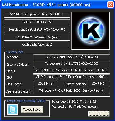 Tak sem stahl MSI Kombustor a dal sem stability test, bezel asi 10minut teplota se vysplhala na 84°C ale po cca minute spadla na 72-3°C a tak se drzela tech 10 min. Pak jsem dal beachmarking a dopadlo to viz. screen