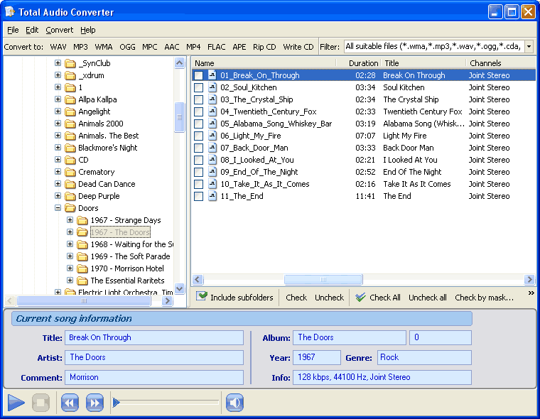Total Audio Converter je nástroj pro vzájemnou dávkovou konverzi audio souborů WAV, MP3, OGG, WMA, APE, FLAC, MP4, AAC a MPC. Total Audio Converter si navíc poradí i s ripováním audio CD do podporovaných hudebních formátů, přehráváním audia a ovládáním pomocí příkazové řádky. Program má velmi přehledné uživatelské rozhraní a samozřejmostí je nastavení kvality výstupních audio souborů.