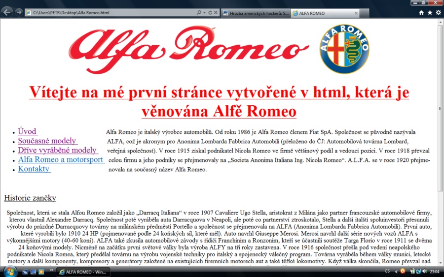 web vcelku vkusný. Jen připomínka : nadpis zkrať na "Vítejte na mých stránkách věnovaným Alfě Romeo". To že to píšeš v html je sice hezké ale jinak je to zbytečná informace. Jednak to nikomu nic neřekne a jednak v čem jiném bys ji chtěl psát ?