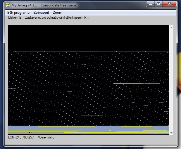 Po delší době jsem dělala defragmentaci dvou disků pomocí programu MyDefrag. U nesystemového disku mě po analýze zarazilo grafické zobrazení - nějaké bílé tečky rozlezlé po 3/4 disku (viz. příloha). Program používám už dost dlouho, ale tohle se mi nestalo.