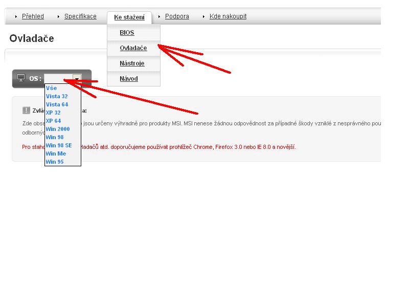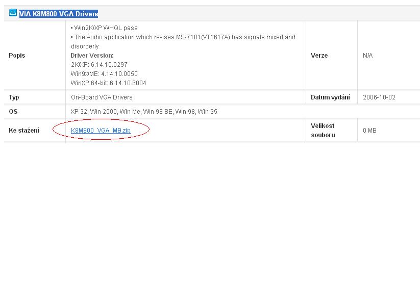 Z té stránky výše vybereš Windows 32 (červená šipka) a pak stáhneš VIA K8M800 VGA Drivers