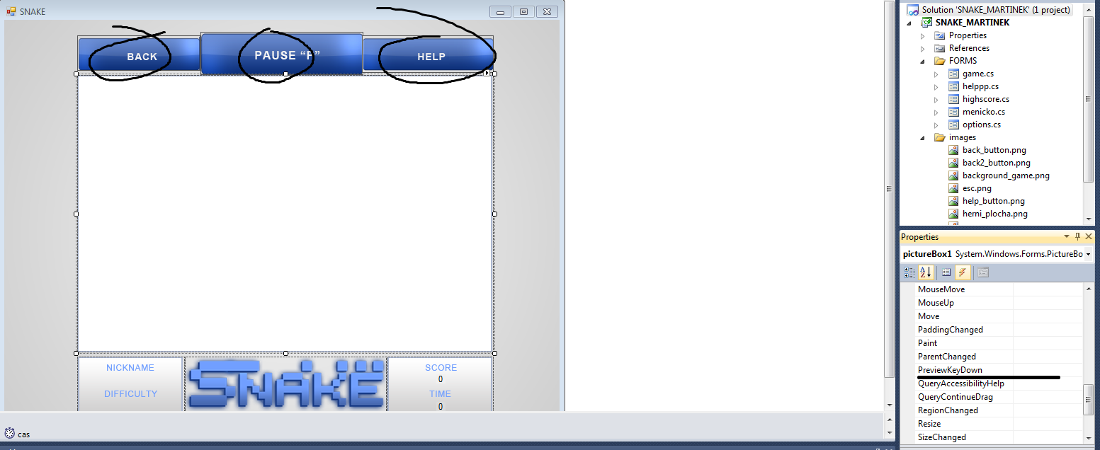 A právě bych tam ty buttony potřeboval viz. screen, když je zneviditelnim, tak had normalně funguje (na formu, nevím jak teda na tom PictureBoxu) :) Ale když tam jsou a mačkám šipky, tak se přepíná mezi Buttonama