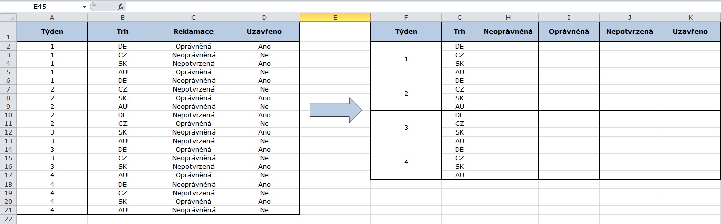 Požadavkem je, aby se v druhé tabulce automaticky počítala suma každého pole za určitých navazujících podmínek. Zdrojová data jsou pouze ukázková, ve skutečnosti bude třeba v prvním sloupci 100x 1. týden. Potřebuji tedy, aby např. pole H2 vytáhlo z A:A pouze 1, následně to omezilo na DE ve sloupci B, pak ještě na slovo Neoprávněný ve sloupci 3 a vypsalo celkový počet těch polí, které těmto podmínkám vyhovují.