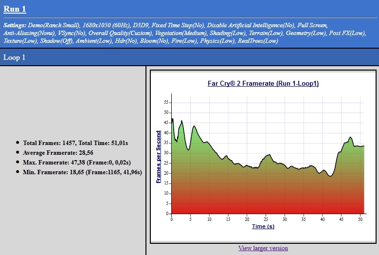 Ukázal sice hodnotu pod 25FPS což není optimální,ale jak jsem psal - hra běžela plynuleji.To je způsobeno jednak tím,že benchmark je náročnější a jednak zapnutým frapsem.