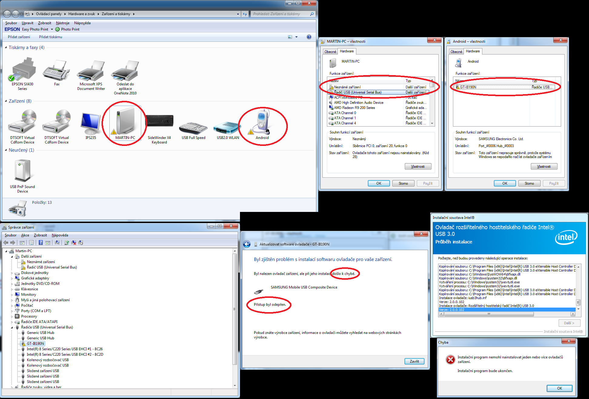 Bohužel. Instalace řadiče USB opět stejná chyba, jak je možné vidět na prvním screenu tématu (že byl ukončen atp.) a přiřazení nainstalovaných driverů pro neznámé zařízení také chyba "přístup odepřen"