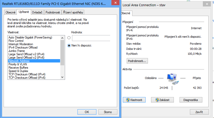 Často mi spadne net, nebo stačí zapnout komp a net nejde, musím to řešit změnou Network Address na síťovce, k tomu jsem si našel batch file. POkud nechám zakliknutou výchozí hodnotu, viz. příloha, nic se nemění, občas to jde občas ne.