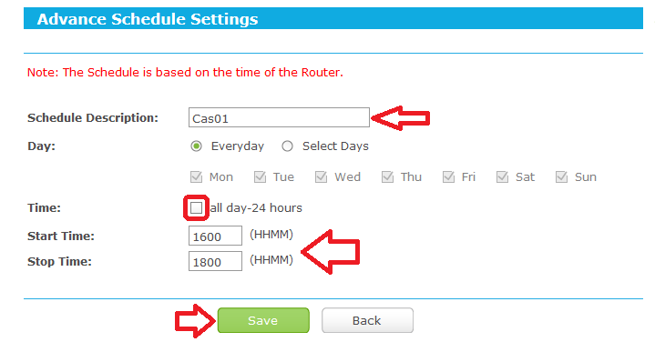- Schedule. Zde si vytvoř pravidlo pro časové omezení