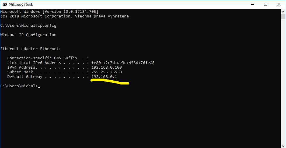 Bod 3. zadám do příkazového řádku ipconfig. Ukaže se mi Gateway a číslo. To zkopíruju a zadám do webu. Webová stránka se ale už bohužel nenačtě. Přitom s prvním routerem jsem neměl problém.