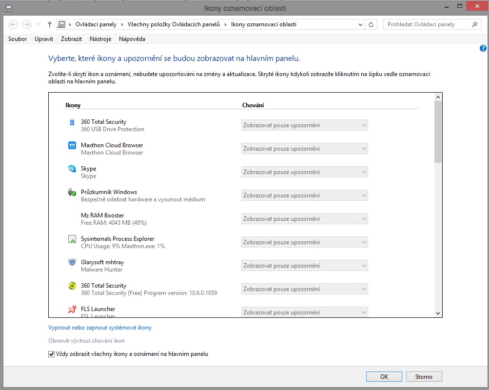 To je správně. Já mám "Vždy zobrazit všechny ikony na hl.panelu" úmyslně. Chci vidět vše co běží.