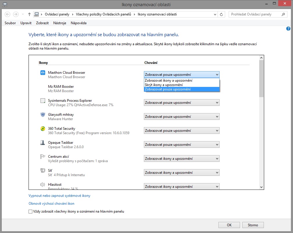 Když to porovnám se svým nastavením, tak nemám zaškrtnuto "Vždy zobrazit všechny ikony na hlavním panelu" a u jednotlivých ikon mám nastaveno "Zobrazit ikony a upozornění".