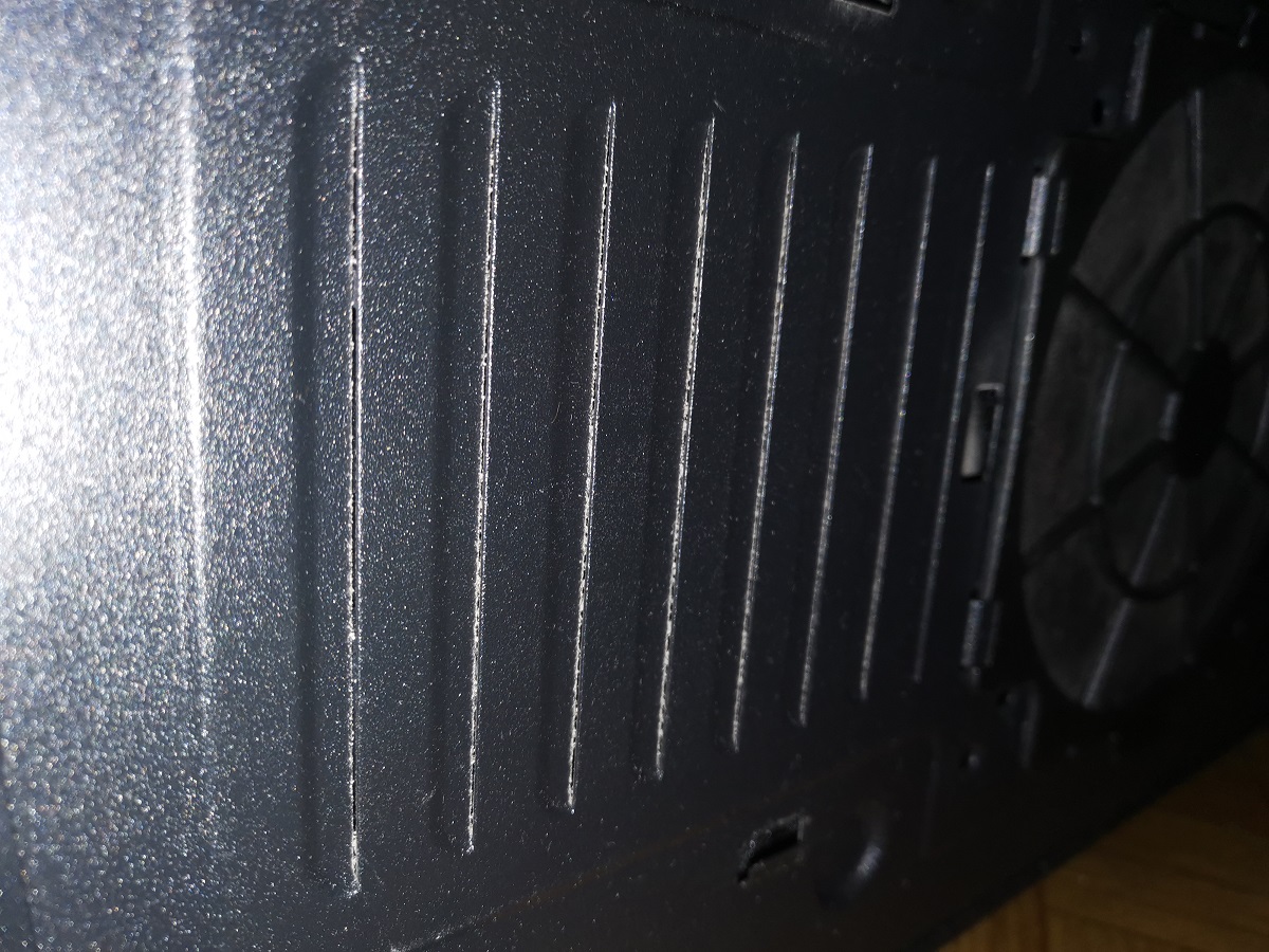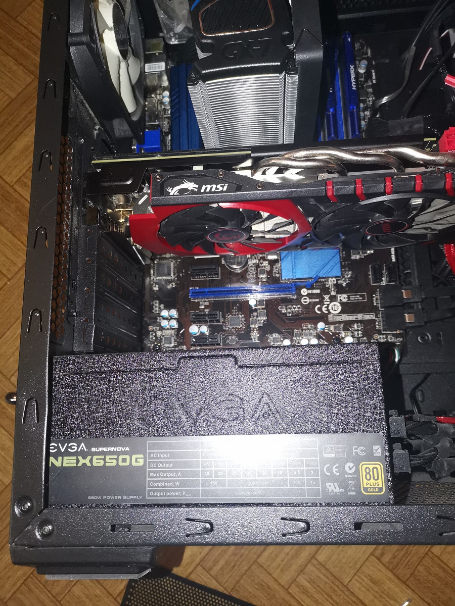 Nejsem si jistý, jestli to souvisí s problémem, ale zdroj takhle nemůže být dobře chlazen. Není orientovaný špatně-zdroj má nasávat chladný vzduch odspodu a vyfukovat ven. Dole má být otvor, ale očividně ho výrobce skříně jaksi nevyřezal. Zdroj bych tedy otočil ať má alespoň nějaký přísun vzduchu.