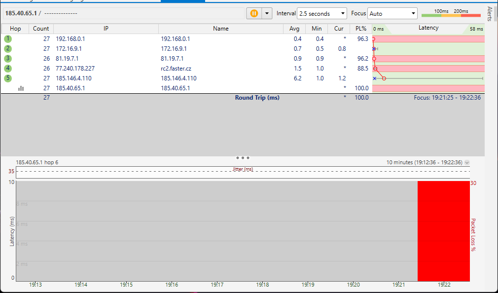 Hned první hop. To bude tvůj router. není divu, že to zlobí, když je skoro polovina paketů ztracených.