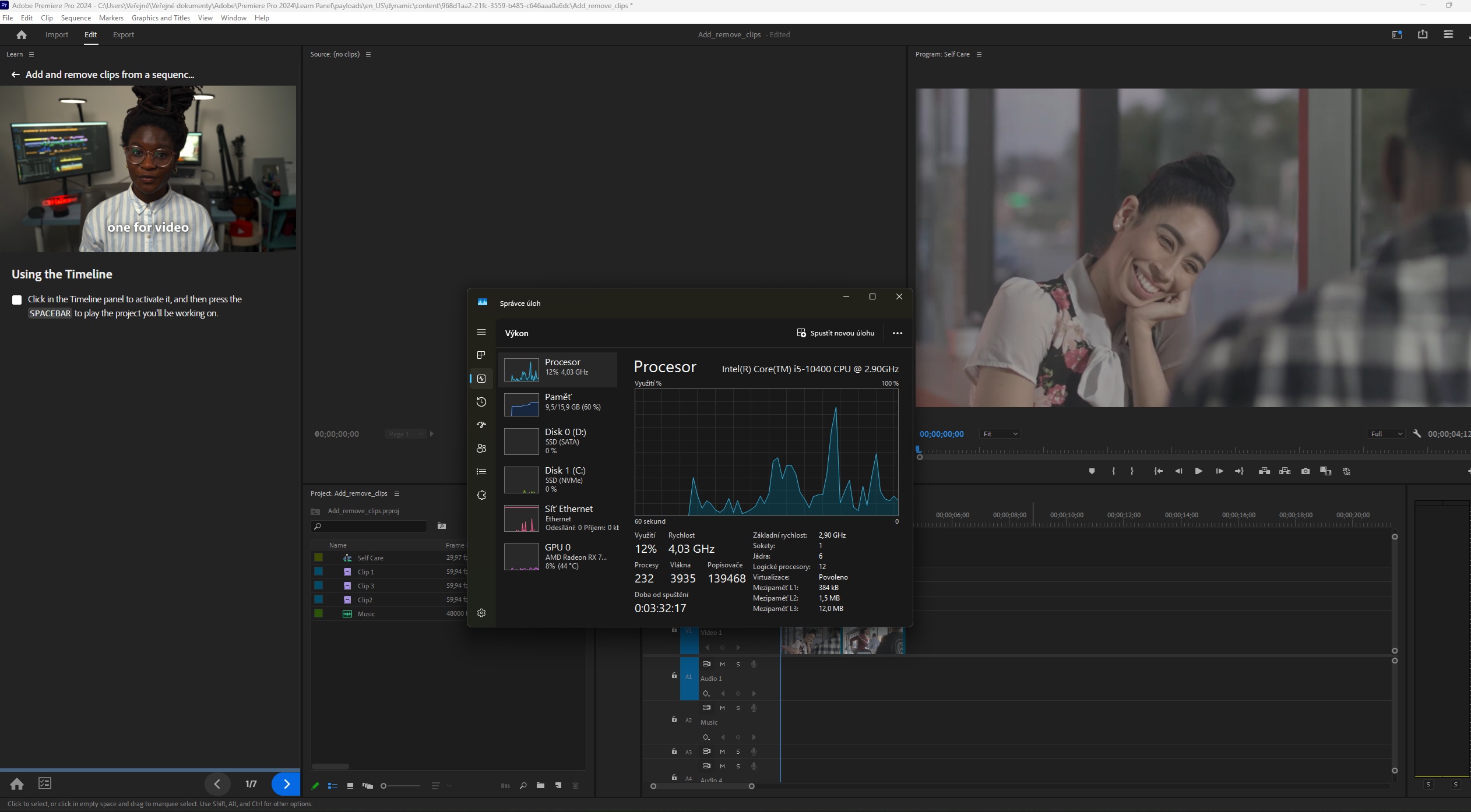Zkontroluj zátěž CPU a RAM při přehrávání videa v Premiere, jestli není některý z těchto komponent přetížený. Pokud je, zvaž uzavření dalších aplikací nebo zvýšení výkonu v nastavení Premiere (např. snížením rozlišení náhledů).