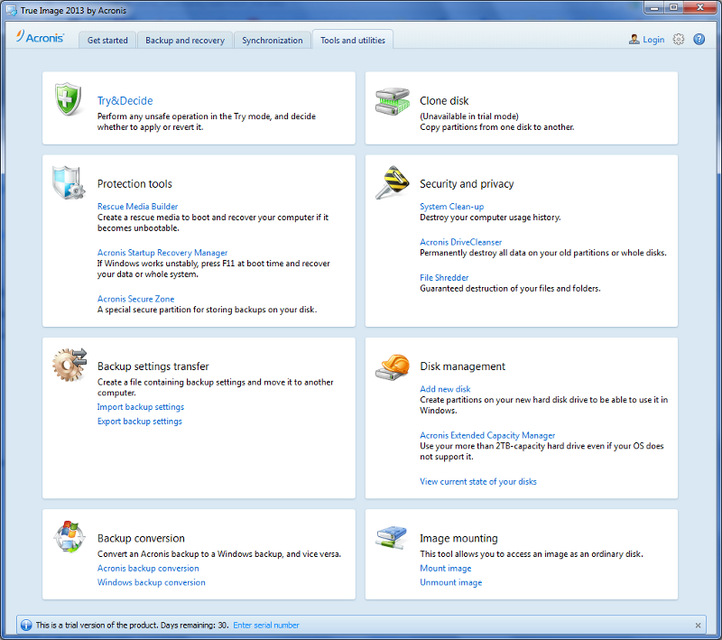 Acronis TrueImage Home 2013 je universální zálohovací řešení pro Windows XP a vyšší s již deklarovanou podporou pro Windows 8. Nabízí nejrůznější způsoby zálohování, které lze kombinovat dle potřeby. Umí zálohovat kompletní obsah pevného disku včetně operačního systému a nainstalovaných programů, takže při havárii disku lze vše obnovit ze zálohy bez nutnosti znovu instalovat operační systém, potřebné programy a vše pracně nastavovat dle svých potřeb a rozmarů.
